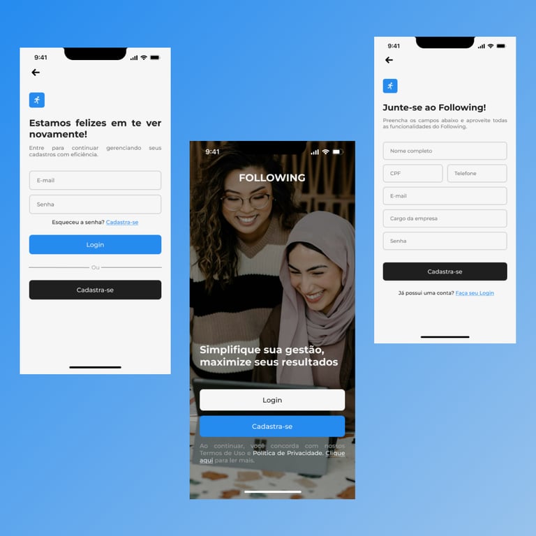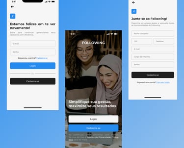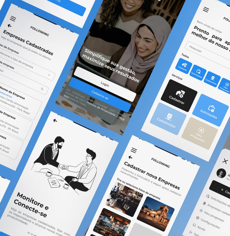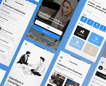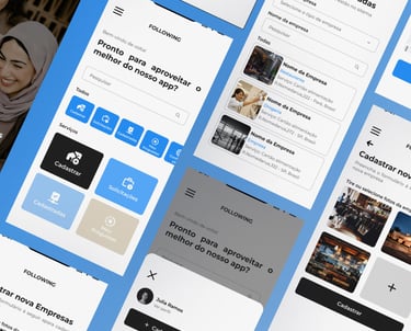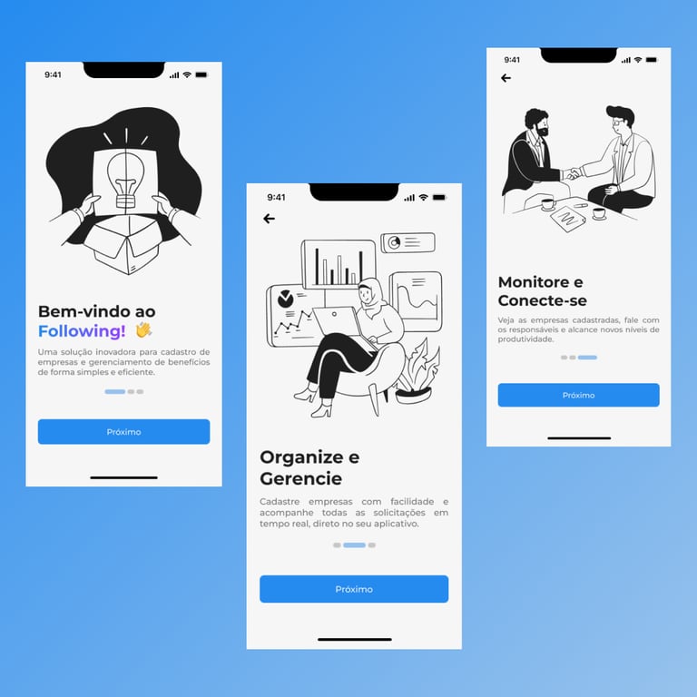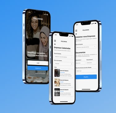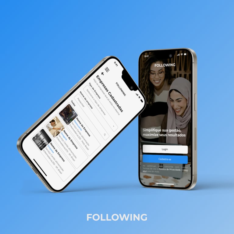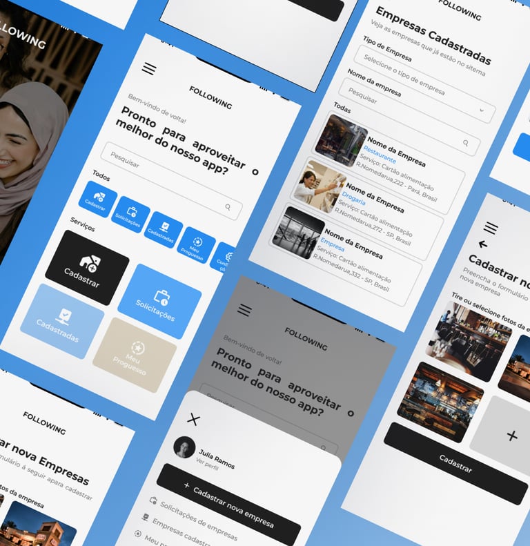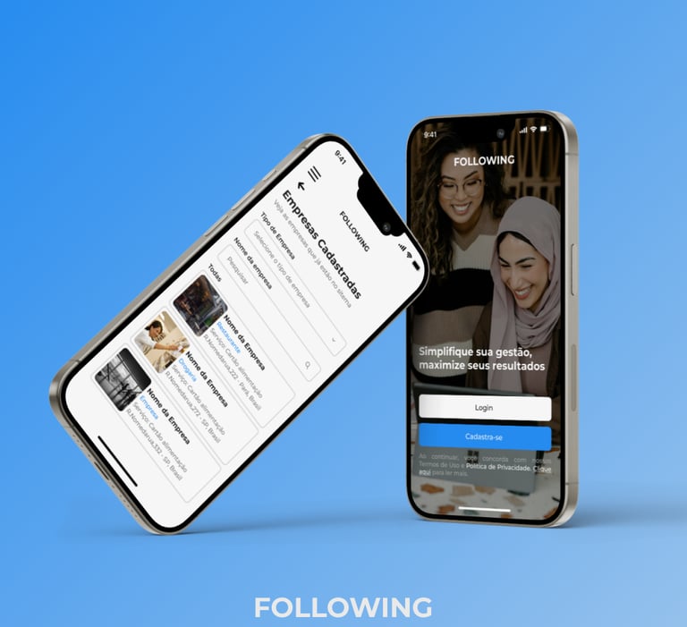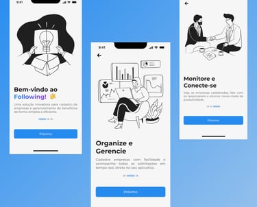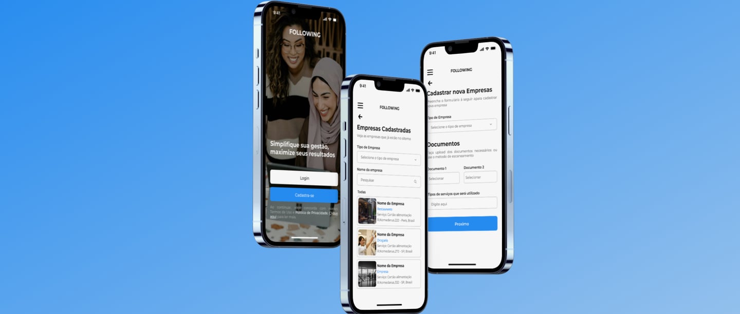 Following é um aplicativo corporativo focado em facilitar o cadastro e a gestão de empresas para uso de cartões de benefícios. Ele permite que funcionários registrem empresas, acompanhem solicitações pendentes, monitorem seu progresso e se comuniquem via chat com responsáveis. O app também oferece um dashboard intuitivo para visualização de dados e relatórios, garantindo uma experiência eficiente e organizada para administradores e colaboradores. Com um design centrado na usabilidade, o Following une produtividade e simplicidade em um ambiente digital acessível.